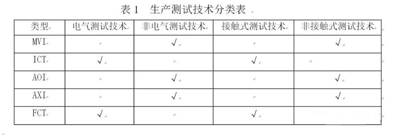 它們可以根據(jù)PCBA是否通過(guò)加電歸為兩大類:一種是電氣測(cè)試技術(shù),一種是非電氣測(cè)試技術(shù);也可以根據(jù)PCBA是否和測(cè)試設(shè)備接觸分為兩大類:一種是接觸式測(cè)試技術(shù),一種是非接觸式測(cè)試技術(shù)。見(jiàn)表1,供參考。
