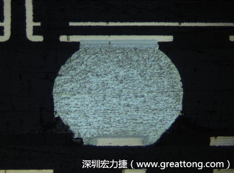 通常拿到一張BGA的切片照片時(shí),第一個(gè)要判斷的就是那一邊屬于BGA的封裝面,那一邊又是屬于電路板組裝面。對(duì)于這個(gè)問(wèn)題,我的方法是從銅箔的厚度來(lái)做判斷,銅箔比較厚的那一面通常是電路板組裝面,因?yàn)锽GA封裝的載板通常都比電子組裝的電路板來(lái)得薄,所以會(huì)選用比較薄的銅箔厚度。